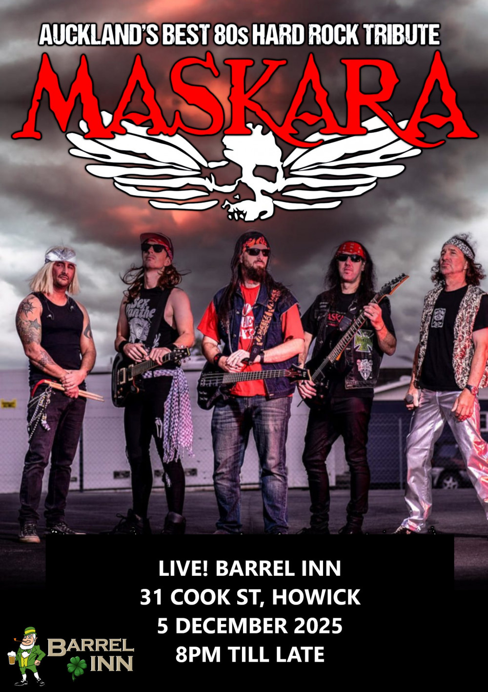Celebrated for both their musicianship and commitment to the genre, Maskara remains a go-to choice for fans of 80s rock looking to relive the hair metal era on stage in Aotearoa.
